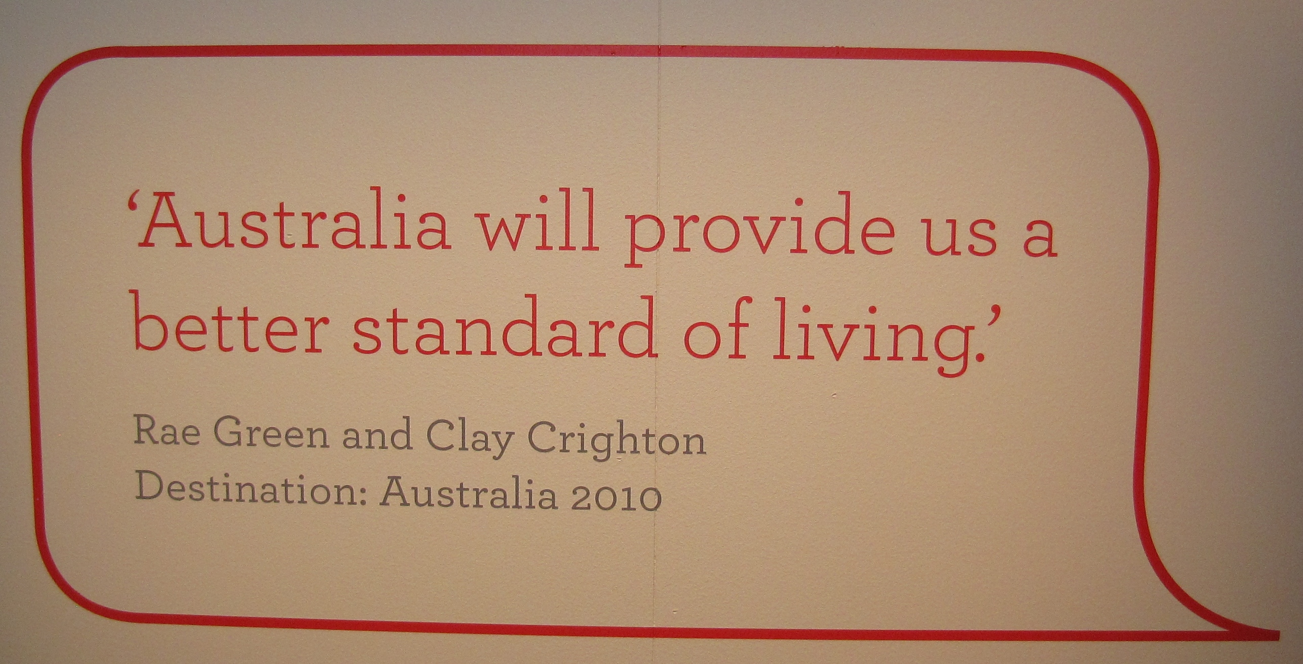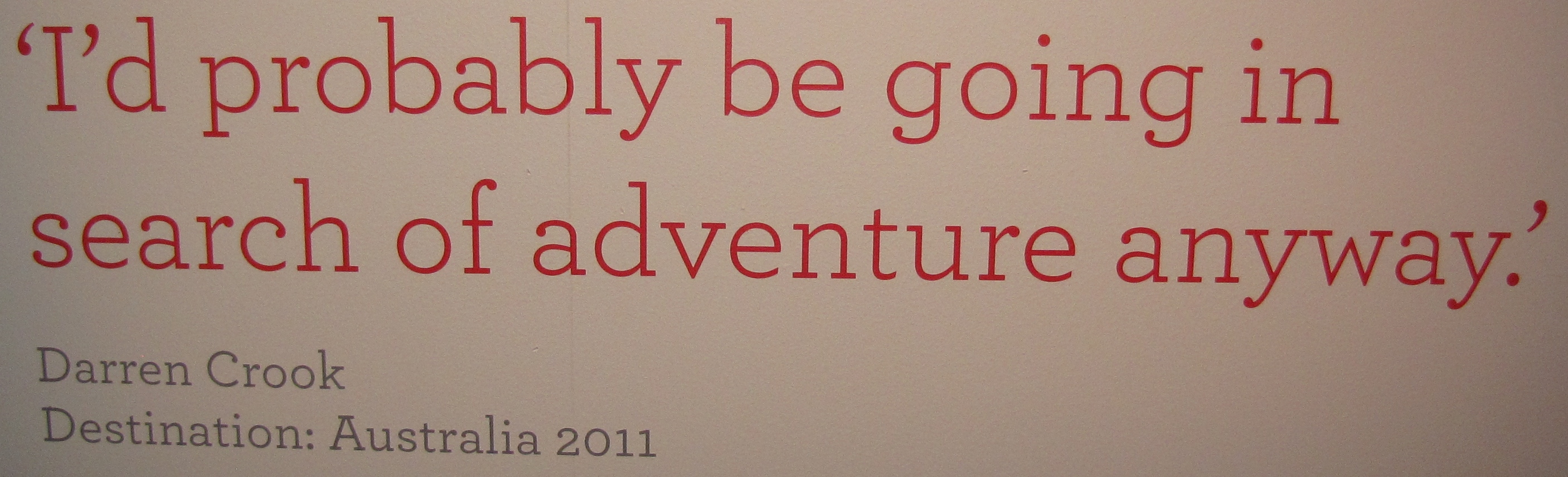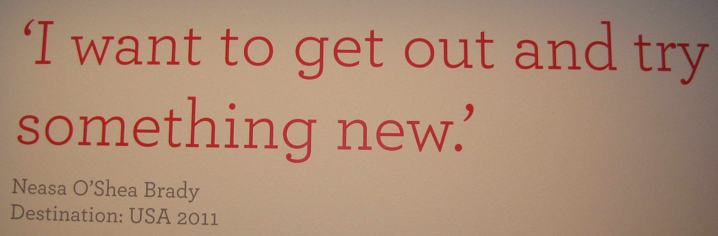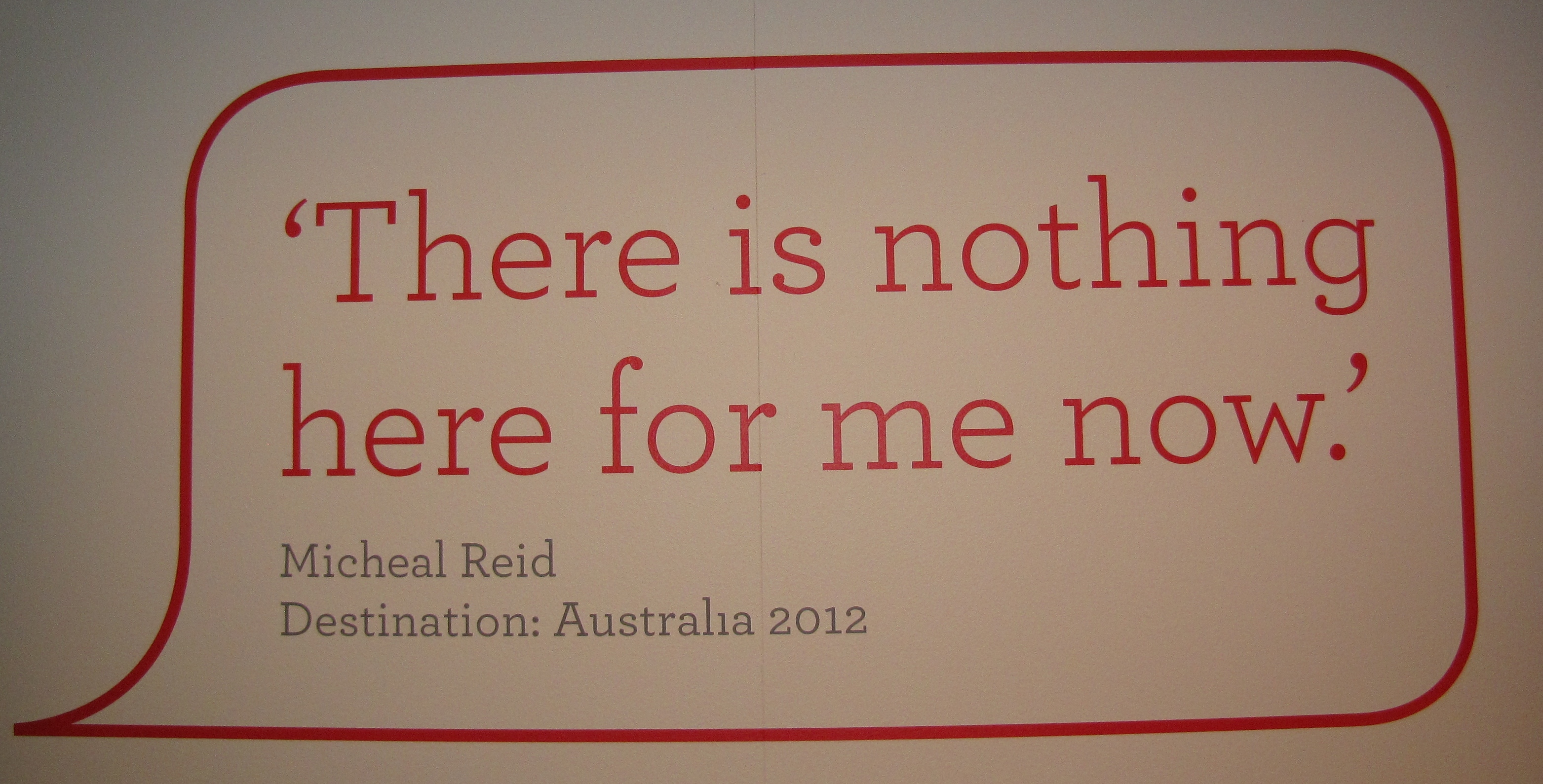An Easter trip to Melbourne brought me to the Immigration Museum, which is currently showing an exhibition called Leaving Dublin. It features photos of people about to leave Ireland, captured over the last three years by Irish photographer David Monahan. Many of these new migrants have tried to explain why they’re leaving, and these quotes add depth to the pictures – stories of despair, hope, excitement, adventure, the basic need for a job.