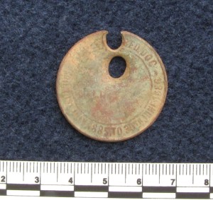 So … by 1884, you had to pay 7s 6d to register your dog, and have it wear a tag. And it appears that the dog owners of Baker’s Flat were determined to toe the line. The photo below shows what appears to be a bullet hole in an 1885-1886 dog tag – the original punched hole (which usually held an attachment rivet) is broken; perhaps the dog owner was so keen to have that tag on the collar that he shot it to create a new hole.