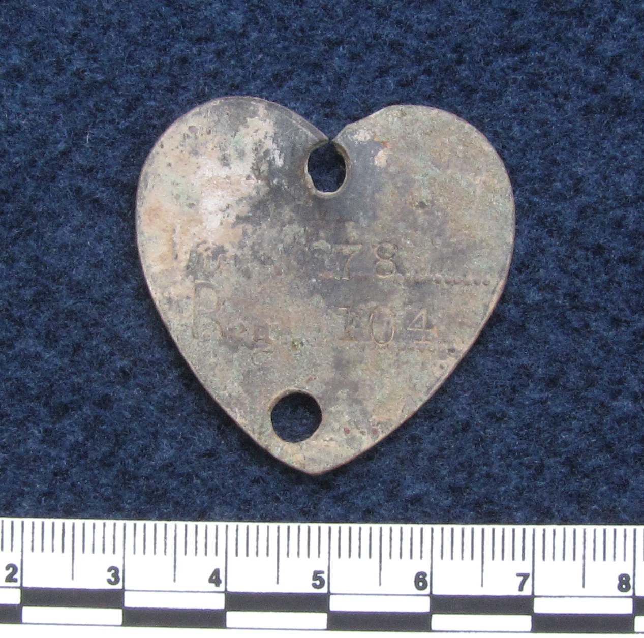 The tag below, for 1890-1891, is heart-shaped. The attachment rivet is missing, and there’s another hole near the base, although this one doesn’t look like a bullet hole. The face has embossed dots all the way round. The back is plain and worn, but it’s still possible to make out the registration number 104 and the district 78.