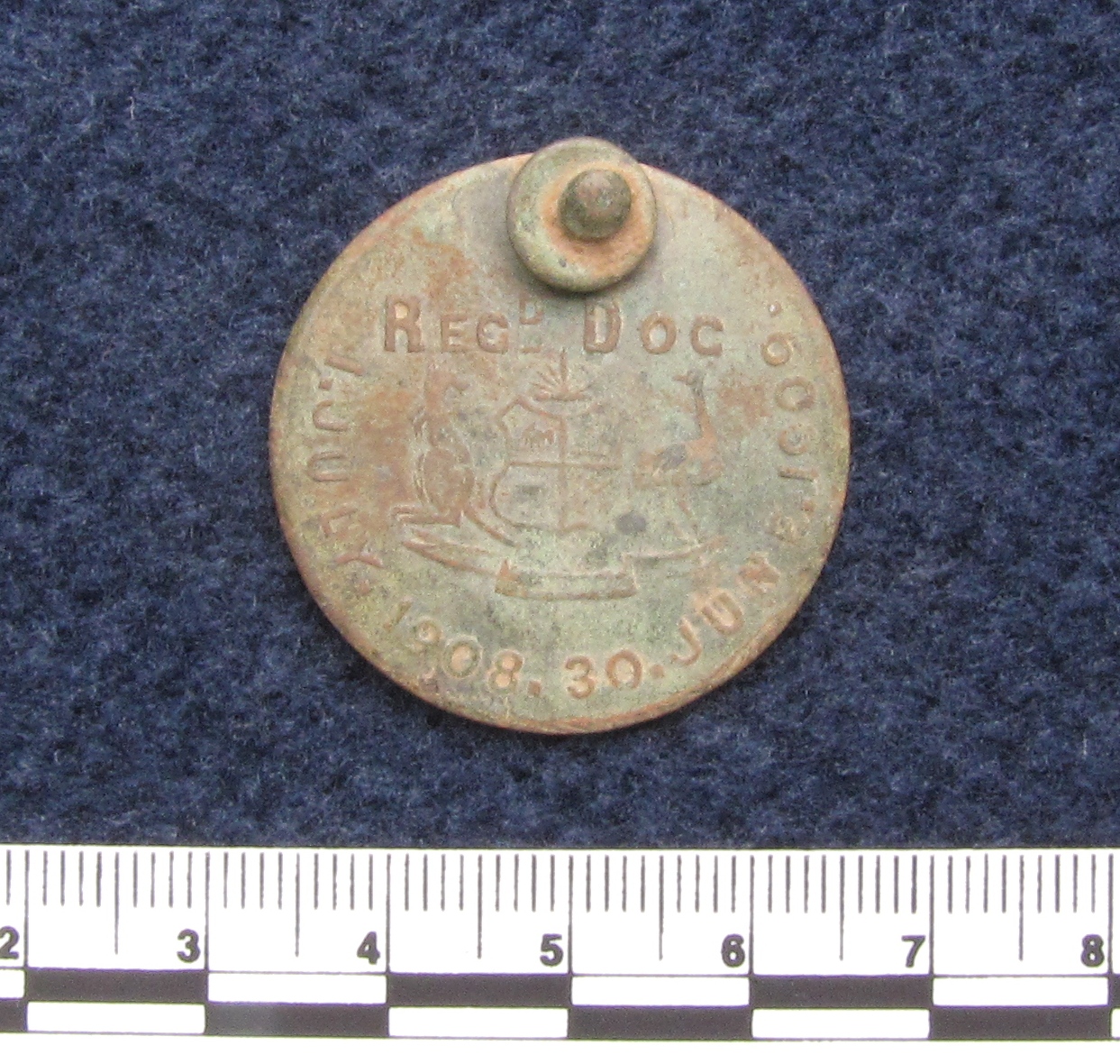 The 1908-1909 tag below is circular and retains its rivet. On the face, you can see that it’s stamped ‘Regd Dog’, has an Australian coat of arms featuring the kangaroo and emu, and the date 1 July 1908 30 June 1909. On the back, the registration number is stamped 28 and the district 78.